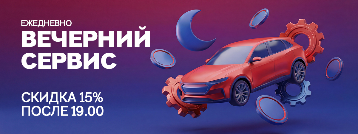 * Скидка 15% на работы при заезде после 19:00. Акция действует ежедневно. Не суммируется с другими специальными предложениями. Подробности уточняйте у мастеров-консультантов сети автосервисов.